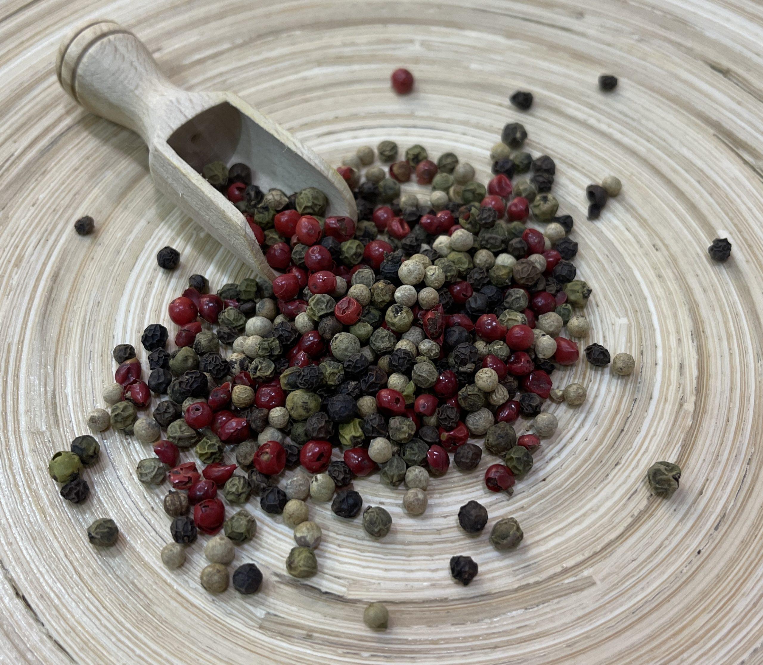 Bunter Pfeffer ist eine Mischung aus grünem, weißem und schwarzen Pfeffer, sowie rosa Beeren. Vielen ist nicht bekannt, dass weißer, schwarzer und grüner Pfeffer von der gleichen Pflanze stammen.